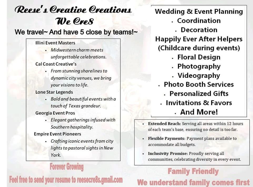 Includes six hours of pre-prep before the wedding day service hours to connect with the client as well as any vendors to make sure things are aligning the right way